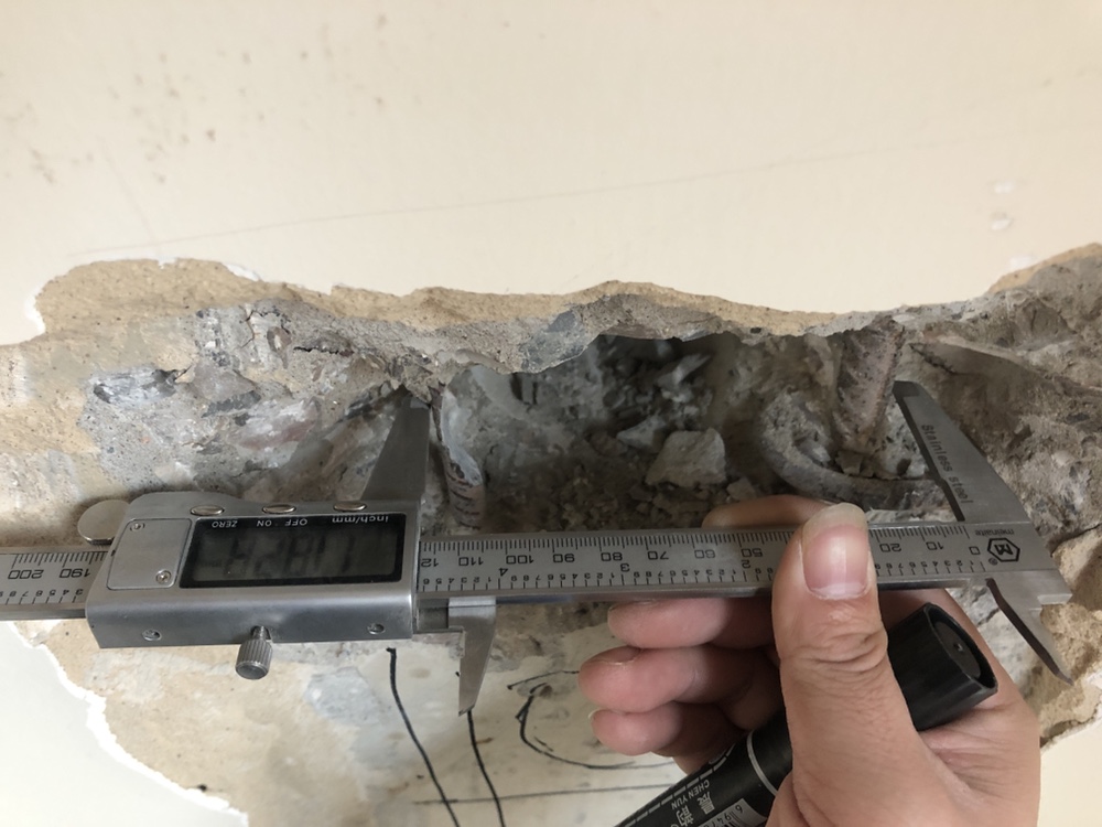測定時把裂縫全長分為四等分,中央點和兩端,以及中央點和中間的第三分點。測定裂縫方向上的垂直寬度,使用帶有刻度的專用顯微鏡,將刻度與縫口垂直,量出縫口寬度,記下讀數并標于圖上。也可以采用裂縫卡通過放大鏡估計裂縫寬度,但這種方法誤差較大。裂縫長度可用鋼尺測量,在裂縫的端部要有標志,標上年月日,以觀測裂縫的發展。在測定裂縫長度和寬度的同時,須同時確認保護層厚度,保護層混凝土厚度不宜用鏨鑿開時,可用鋼筋探測器找出其厚度。